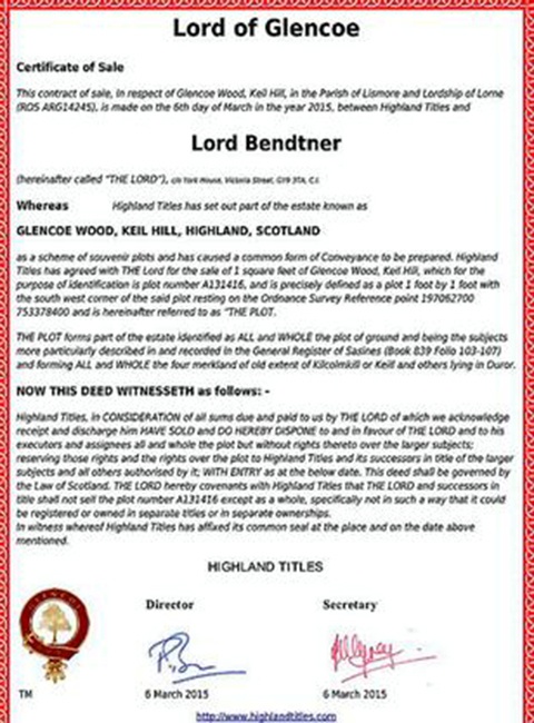 Cụ thế, một tạp chí Đan Mạch đã quyết định mua khoảnh đất có diện tích 0,1 m2 tại khu bảo tồn Glencoe Wood để dành tặng cho "Lord" Bendtner. Fan hâm mộ còn làm hẳn một thông cáo với dấu đỏ chứng thực để hợp thức hóa việc phong tước cho Bendtner.