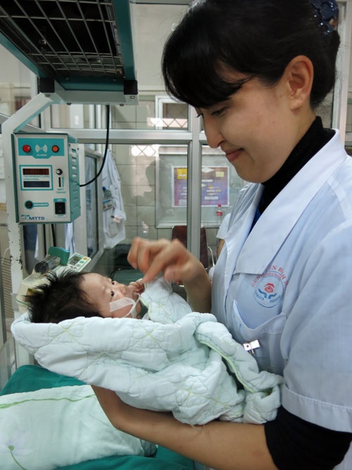 | Điều dưỡng viên Miki chăm sóc các bé ở phòng sơ sinh Bệnh viện Bạch Mai. |
