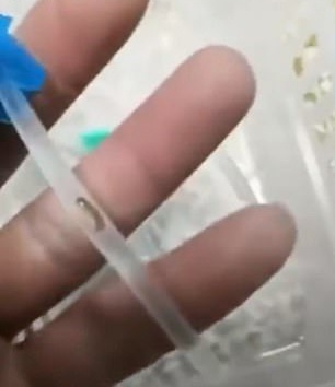 Cận cảnh vật thể lạ trong ống truyền dịch mà đoạn video ghi lại. Ảnh: Pear Video. |