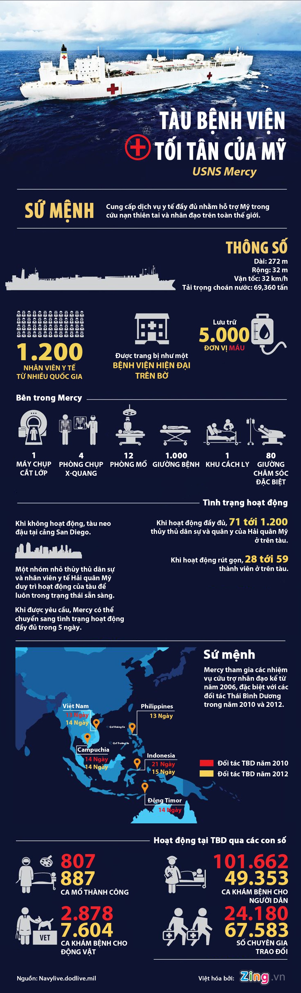 Được trang bị các máy móc y tế tối tân cùng sức chứa lên tới 1.200 nhân viên y tế từ nhiều quốc gia, USNS là tàu bệnh viện hiện đại của Hải quân Mỹ.