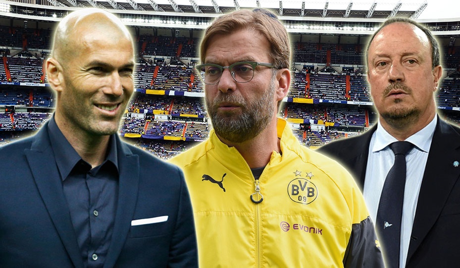 Ba ứng viên hàng đầu thay thế Carlo Ancelotti gồm Zidane, Klopp, Benitez (từ trái qua phải).