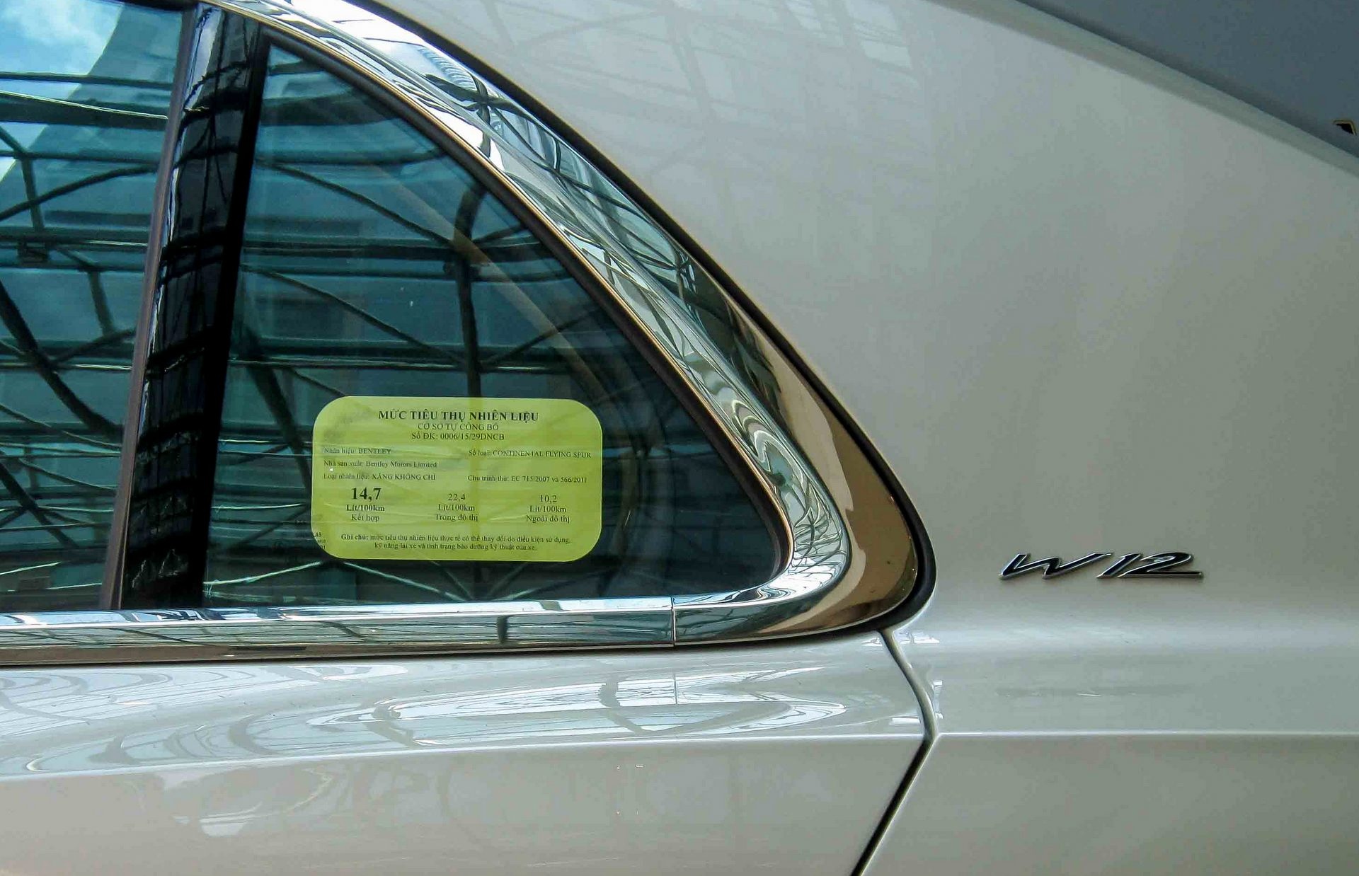 | Cửa xe được bao bọc bởi viền mạ chrome sáng bóng cùng huy hiệu W12 cách điệu ở trụ C. Bên trong là tem ghi mức tiêu hao nhiên liệu. Flying Spur W12 tiêu thụ 22,5 lít/100 km trong thành phố và 10,2 lít/100 km ngoài xa lộ. Mức tiêu hao nhiên liệu trung bình đạt 14,7 lít/100 km. |