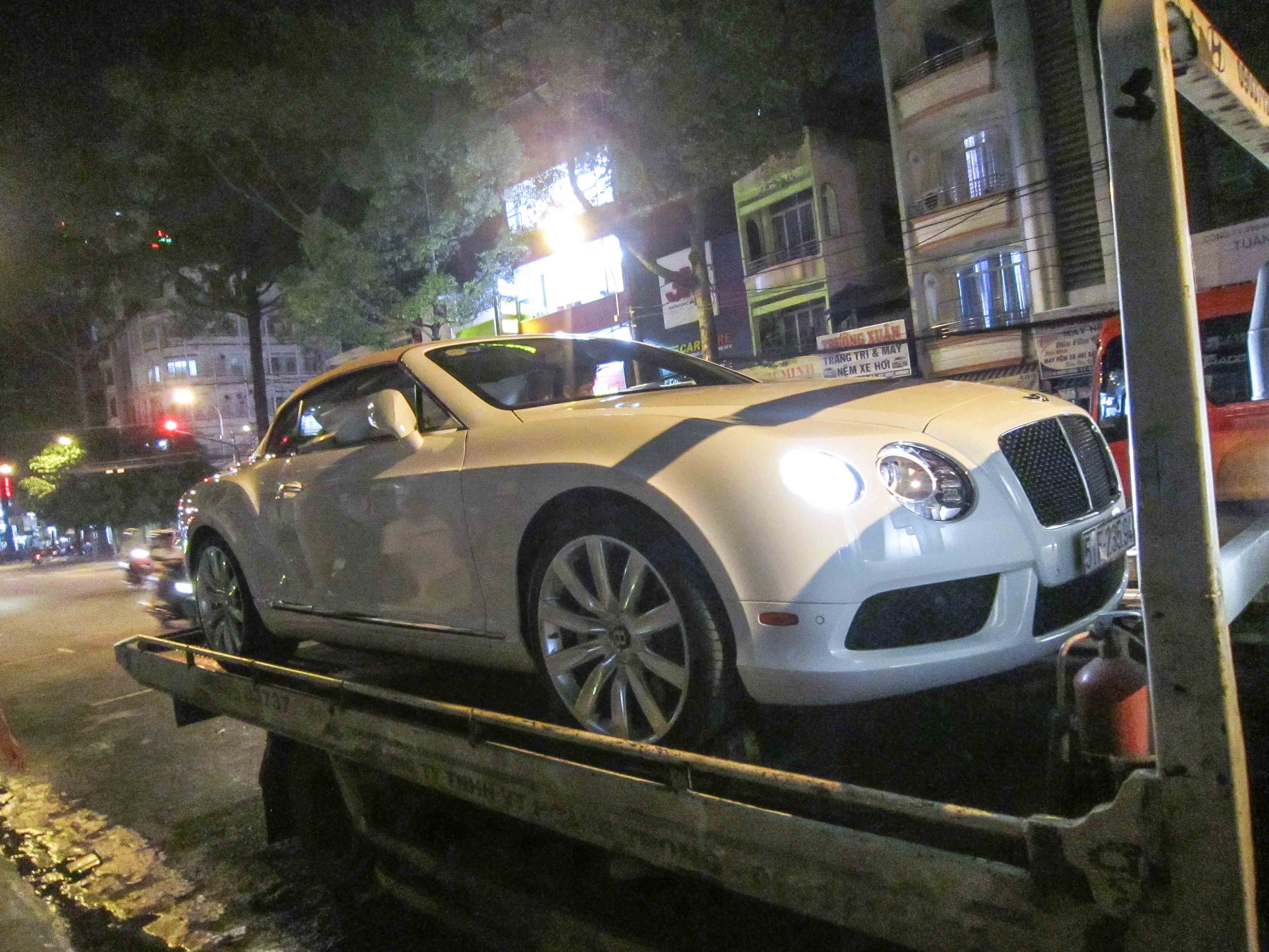 | Tối 6/8, chiếc Bentley Continental GTC V8 2013 đầu tiên ra biển trắng tại Việt Nam được đưa lên xe tải chuyên dụng để vận chuyển ra khu vực miền Trung. |