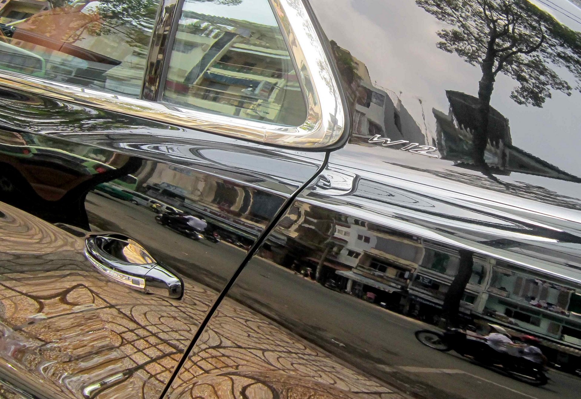 | Biểu tượng W12 được gắn trên trụ C của xe. Bentley Flying Spur W12 lần đầu được giới thiệu tại triển lãm ôtô Geneva tháng 3/2013. Đây là mẫu xe 4 cửa mạnh nhất của Bentley đến thời điểm hiện tại. |
