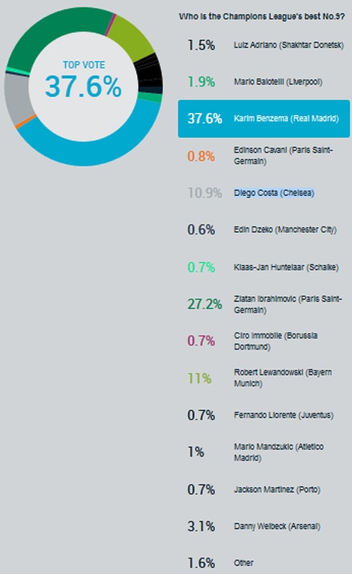 Thể hiện phong độ ấn tượng thời gian qua, Benzema giành số phiếu áp đảo trong cuộc bầu chọn trung phong xuất sắc nhất Champions League từ đầu mùa giải với 37,6%. Ba vị trí tiếp theo lần lượt thuộc về Zlatan Ibrahimovic (27,2%, PSG), Robert Lewandowski (11%, Bayern), Diego Costa (10,9%, Chelsea).