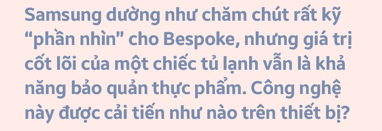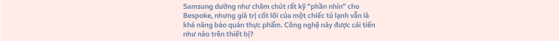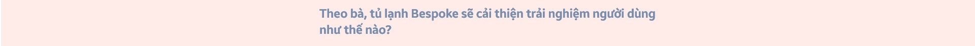Sứ mệnh của chúng tôi là phát triển sản phẩm giúp người dùng tận hưởng cuộc sống tốt hơn. Và Bespoke vượt qua giới hạn của tủ lạnh truyền thống, mở ra kỷ nguyên mới, nơi tủ lạnh không chỉ có chức năng lưu trữ thực phẩm. Bespoke cho phép người dùng thỏa mãn đam mê sáng tạo và bài trí không gian nội thất, thổi hồn phong cách vào căn bếp của họ.