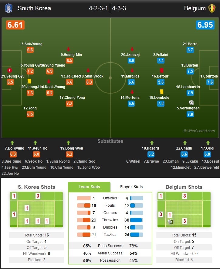15': Pha lên bóng khá nguy hiểm của các cầu thủ Hàn Quốc bên cánh trái, tuy nhiên, quả tạt bóng của Koo Ja-Cheol không thể loại bỏ được hàng thủ chắc chắn của tuyển Bỉ.