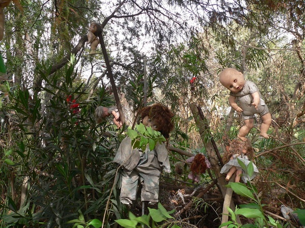 | Tại đây có hàng nghìn con búp bê không còn nguyên vẹn treo lủng lẳng trên các cành cây, giăng khắp nơi xung quanh các ngôi nhà, các cành cây, khắp các lối đi trên đảo. |