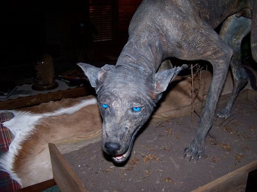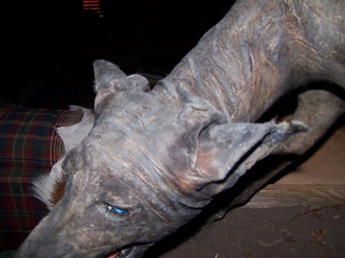 | Nó có lớp da bì như da voi và không có lông như loài chó. |