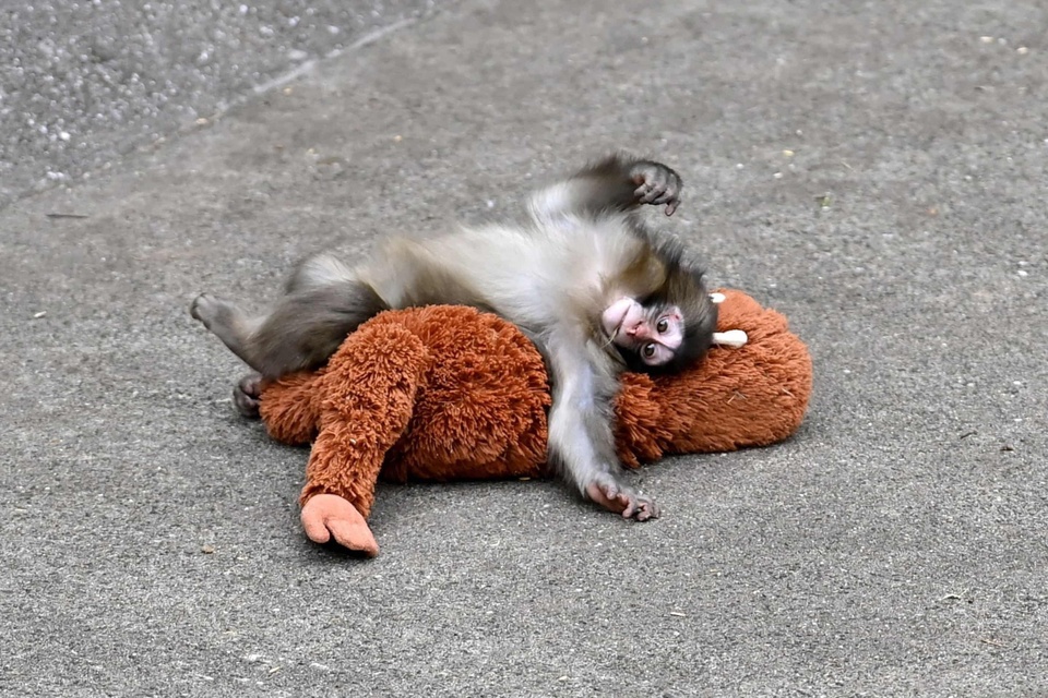 | Bên cạnh thú nhồi bông, Punch còn thường xuyên bám vào chân nhân viên vườn thú. Ảnh: Reuters. |
