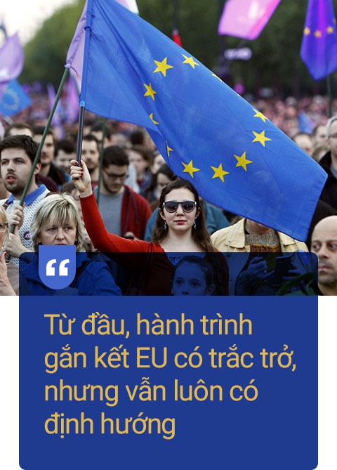 Ngay từ đầu, hành trình gắn kết EU có nhiều trắc trở, nhưng vẫn luôn có định hướng, theo Economist. Các lãnh đạo đến và đi, bức tường Berlin được dựng lên rồi bị phá đổ, những cơn bão kinh tế kéo đến rồi tan. EU vẫn đứng vững.