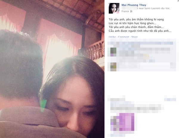 | Hoa hậu Mai Phương Thúy thường xuyên chia sẻ lên Facebook cá nhân những bức ảnh chụp đằng sau người đàn ông lạ mặt. |