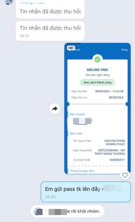 Sau khi thực hiện chuyển tiền như trao đổi, người này lẳng lặng gỡ tin nhắn khỏi phần chat và âm thầm chặn tin nhắn cô. Lúc này cô biết mình đã sai lầm.