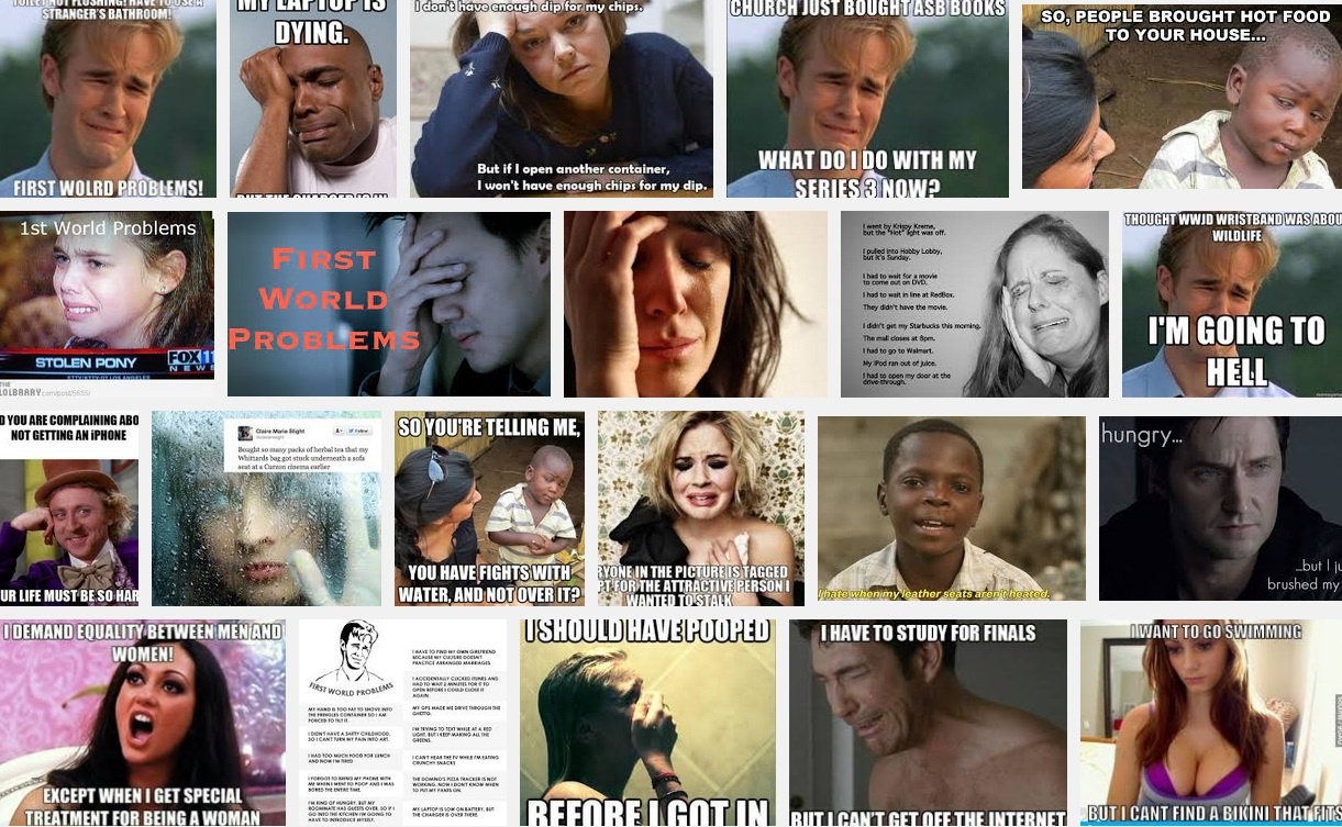 | "First world problems" (tạm dịch: Những vấn đề không quá nghiêm trọng nhưng ai đó lại phàn nàn) là định nghĩa được đưa vào từ điển ngày 10/8 /2005. "First world problems" được trích từ câu hát nằm trong ca khúc nổi tiếng Omissions of the Omen của nhóm Matthew Good Band, sáng tác năm 1995. Câu nói thường đi kèm với hình ảnh gương mặt khóc lóc, đẫm lệ với hàm ý mang tính mỉa mai việc ai đó đang cố tình làm quá nên mọi thứ mà đáng lẽ, không đến mức quá nghiêm trọng. Ngày 26 /11/2008, Tumblr blog có tên "First world problems" đầu tiên được ra đời, đến ngày 9/6 /2009, cụm từ này bắt đầu nổi như cồn trên mạng xã hội. |