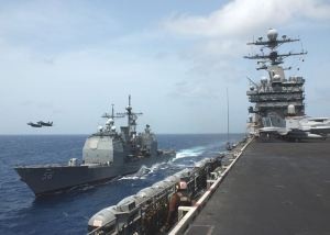 | Ngày 31/7/1964, các chiến hạm USS Enterprise (CVAN 65) (dưới cùng), USS Long Beach (CGN 9) (ở giữa) và USS Bainbridge (DLGN 25) (trên cùng) đã tạo nên Hạm đội 1, hạm đội sử dụng năng lượng hạt nhân đầu tiên. Đội tàu chiến này có thể đi 49.190 km vòng quanh thế giới trong 65 ngày mà không cần dừng lại tái nạp nhiên liệu một lần nào. Lực lượng này đã giúp Mỹ thể hiện sức mạnh tàu năng lượng hạt nhân của mình. |