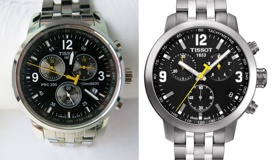 | Đồng hồ giả (bên trái) nhái theo mẫu Tissot PRC 200. |