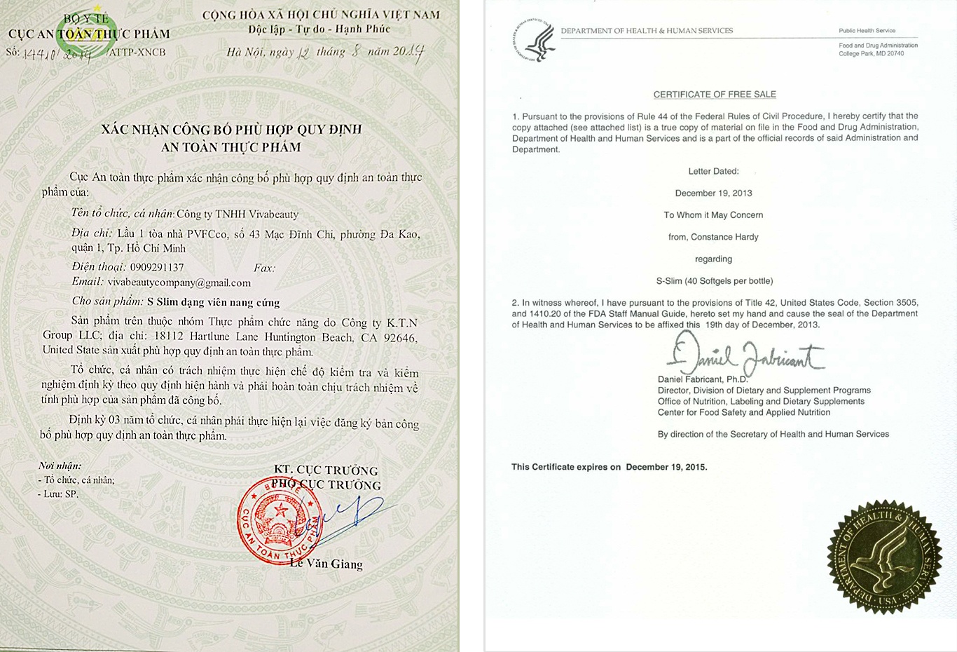 Thuốc giảm cân SSlim của công ty Tigo nhập khẩu từ Mỹ và nhanh chóng thu hút nhiều khách hàng. Sản phẩm có giấy chứng nhận chất lượng của Cục An toàn Thực phẩm, Bộ Y tế Việt Nam, đồng thời được Cục An toàn Thực phẩm và Dược phẩm Mỹ (FDA) chứng nhận nguồn gốc sản xuất và cho phép phân phối ra quốc tế.