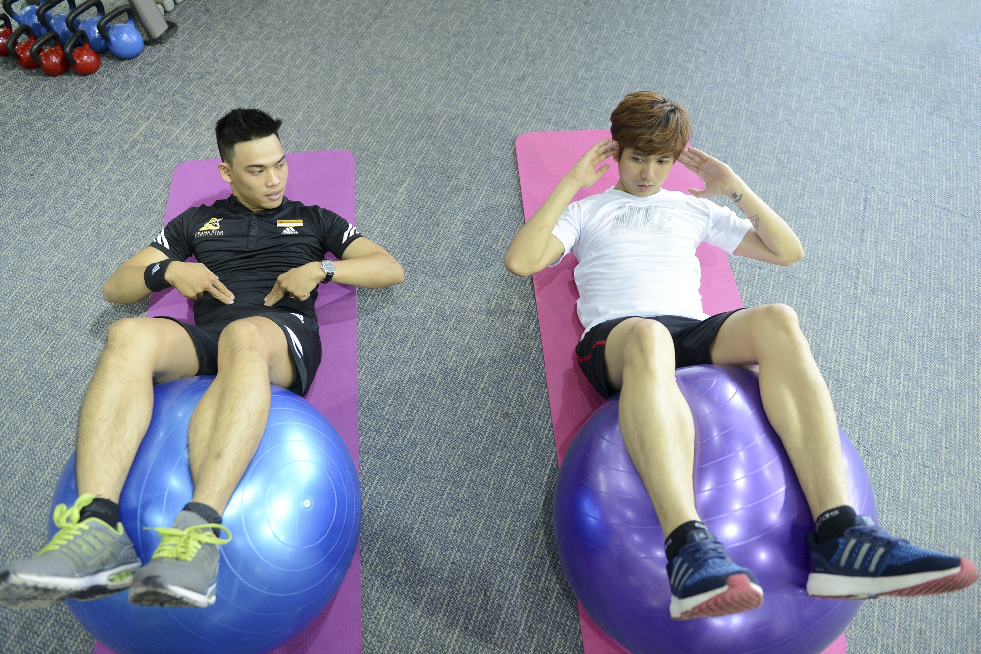 Ngoài giảm cân, Tim lựa chọn bài tập Ke bụng trên với bóng để đốt cháy vùng mỡ tại vòng hai.