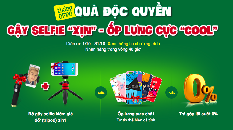 Ngoài ra, Thế Giới Di Động còn có thêm ưu đãi đối với những khách hàng muốn sở hữu bộ quà tặng thời trang nhưng chưa đủ điều kiện tài chính. Theo đó, khách hàng có thể tiếp tục tiết kiệm hàng tháng mà vẫn có thể mua ngay một sản phẩm OPPO nhờ chương trình trả góp 0% lãi suất. Chỉ cần hoàn thiện hồ sơ, sau 30 phút, khách đã có thể sở hữu một chiếc điện thoại OPPO cùng bộ quà tặng hấp dẫn. Các sản phẩm phân phối tại Thế Giới Di Động đều được bảo hành chính hãng.