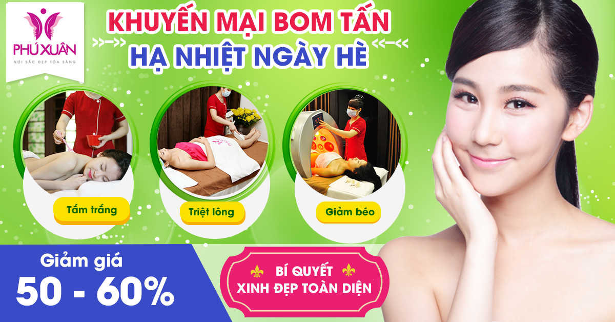 - Gói đặc biệt giảm lớn nhất 60% tặng kèm 1 buổi tắm trắng/triệt lông/giảm béo miễn phí 100%. Ngoài ra, khi quý khách mua 1 trong 3 gói dịch vụ trên sẽ được tặng thêm sản phẩm đi kèm tại Phòng khám chuyên khoa thẩm mỹ Phú Xuân.