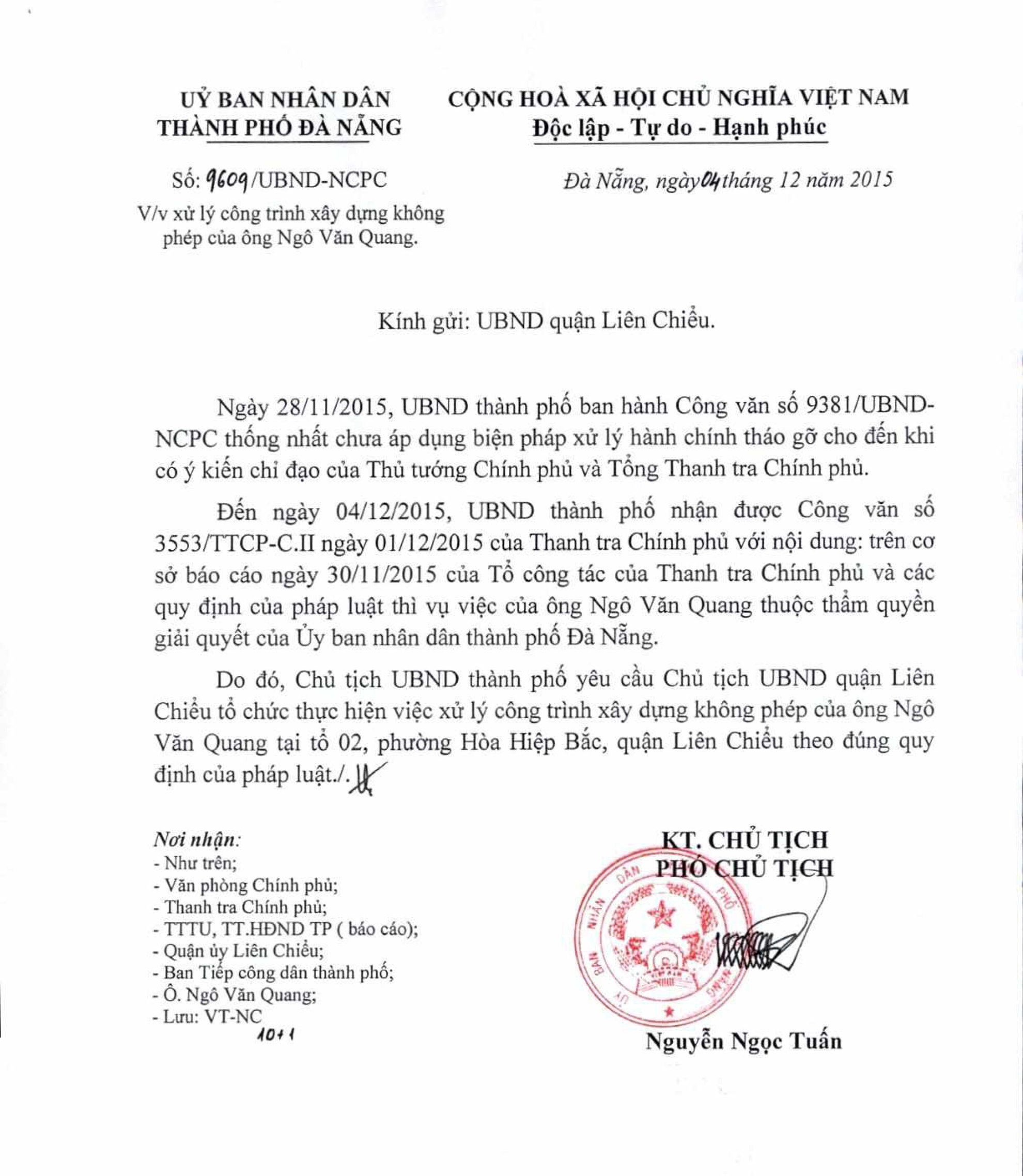 Chiều cùng ngày, ông Nguyễn Ngọc Tuấn - Phó Chủ tịch UBND TP Đà Nẵng ký công văn số 9609 gửi UBND quận Liên Chiểu về việc xử lý công trình xây dựng không phép trên.