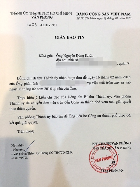 Ngoài việc báo công an, ca sĩ gốc Hà Nội còn gửi thư tới Thành ủy TP HCM và Bí thư thành ủy Đinh La Thăng vào ngày 17/2. Đăng Khôi vô cùng bất ngờ vì chỉ trong 2 ngày, kể từ ngày gửi thư, anh đã nhận được thư hồi đáp từ lãnh đạo thành phố.