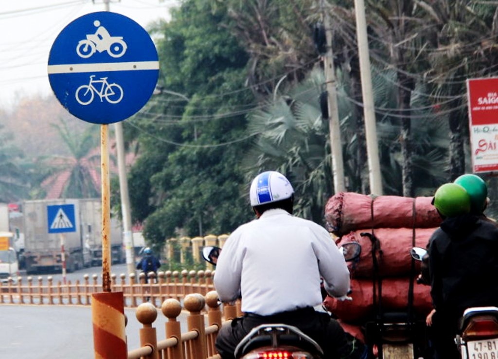 Hàng chục biển báo “đi kèm” được dựng lên, bảng hiệu này là một ô tròn màu xanh, đường ngăn một vạch trắng ở giữa, phía trên in hình người lái môtô, phía dưới là hình người đi xe đạp.