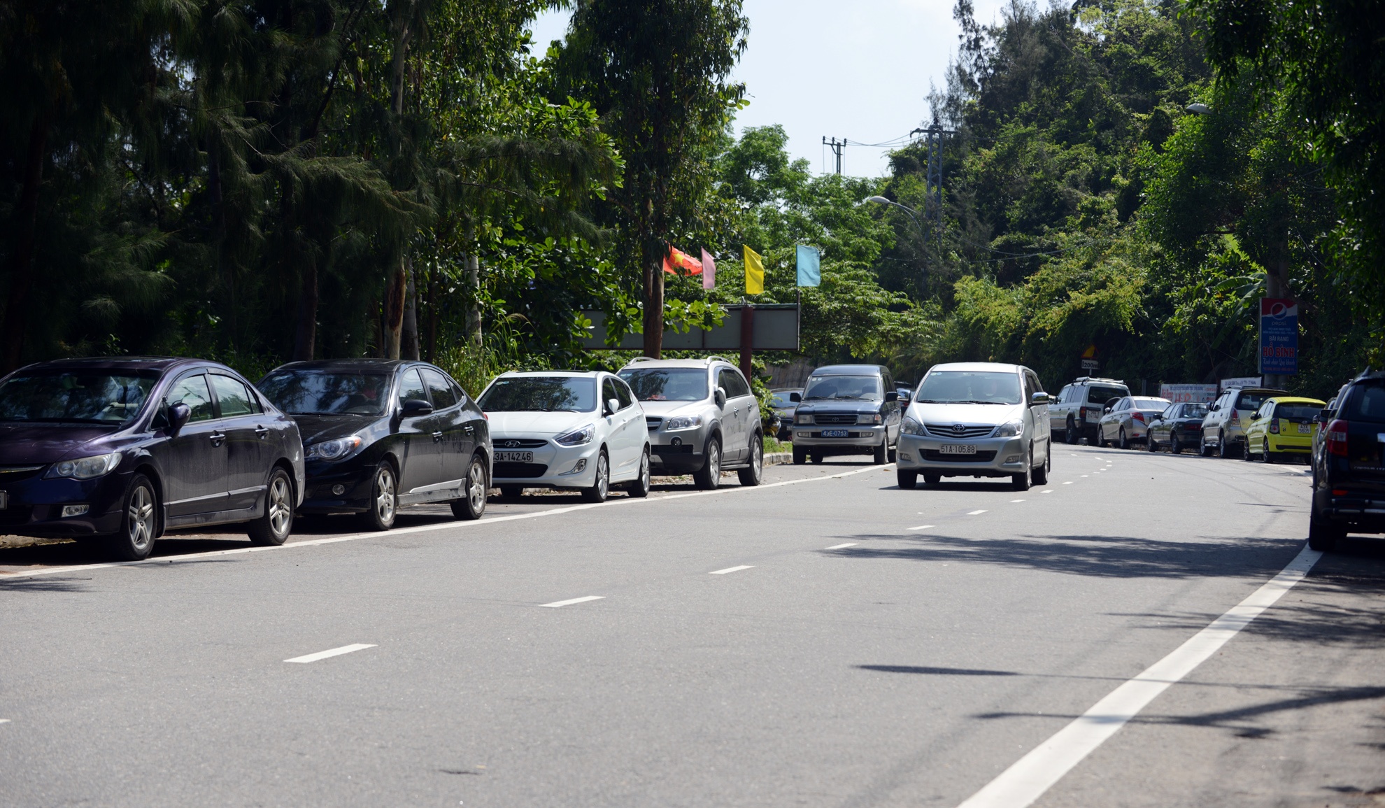 | Con đường lên khu vực tắm bãi Bụt ở bán đảo Sơn Trà, ô tô đỗ dọc kín con đường nhỏ. |