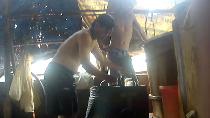 Sau đó ông vận hành trục quay đánh tiếp một lần nữa để cho ra một loại dung dịch màu nâu đen sánh mịn. Khâu tiếp theo, ông Sáng lọc lấy các hạt nhỏ li ti dưới đáy nồi, còn phần nước thải hôi thối được xả thẳng xuống cống chảy ra hồ chứa phía sau cơ sở.