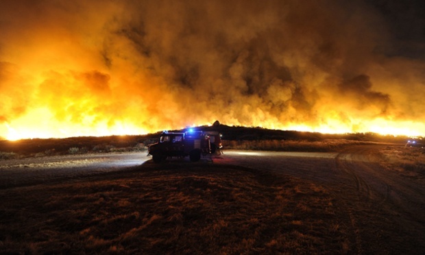 | Một xe tải đậu gần một đám cháy rừng lớn ở vùng Serra do Caramulom, Bồ Đào Nha hôm 21/8. Ảnh: Guardian. |