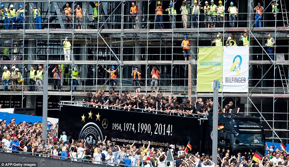 | Những công nhân xây dựng tại các công trường xung quanh thủ đô Berlin cũng tạm nghỉ làm để chào đón cầu thủ diễu hành trên xe buýt. Trên chiếc xe chở đội có ghi 4 cột mốc tuyển Đức VĐTG vào các năm 1954, 1974, 1990 và 2014. |