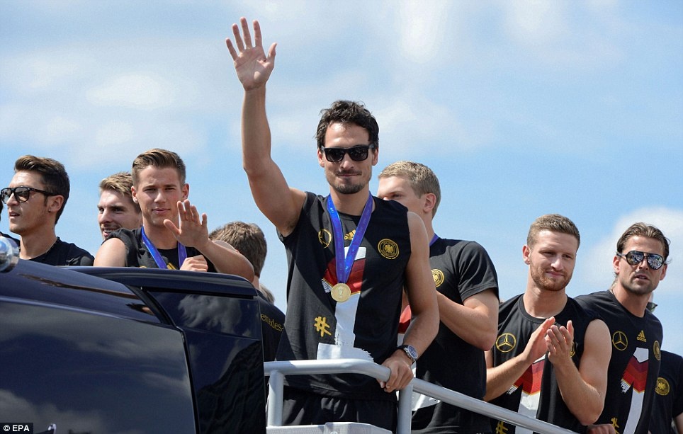 Trung vệ Mats Hummels đeo huy chương vẫy chào người hâm mộ. Anh đã ghi 2 bàn thắng quan trọng vào lưới Bồ Đào Nha ở vòng bảng và Pháp tại vòng tứ kết.