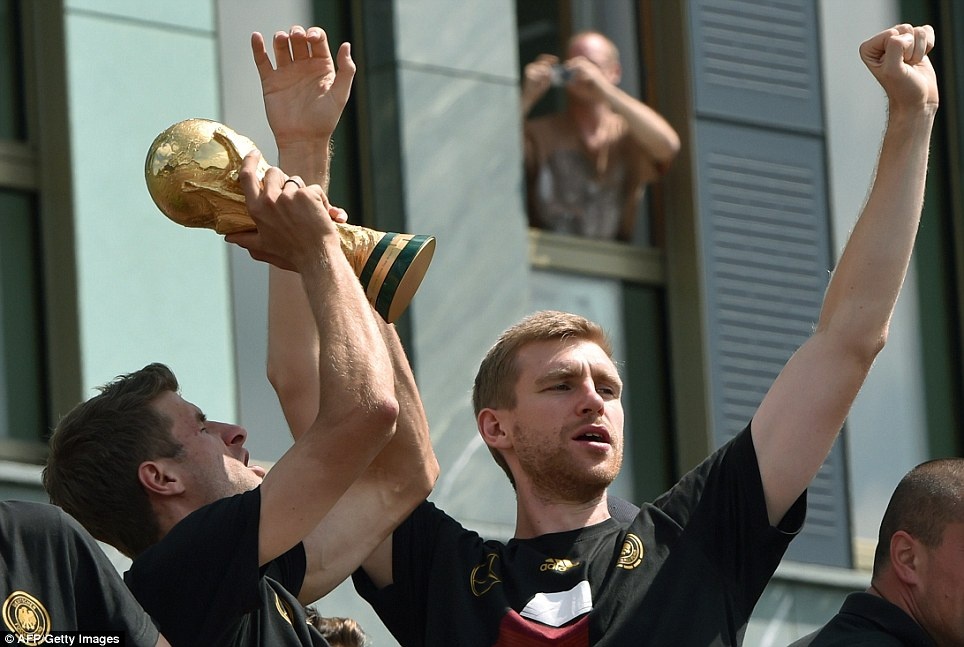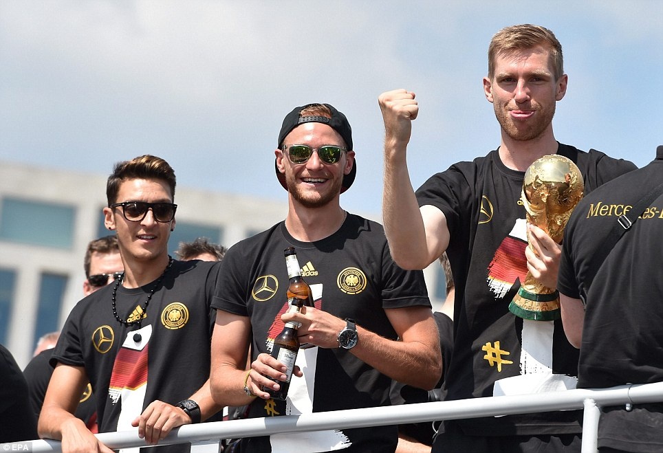 | Trung vệ Mertesacker cầm chiếc Cup thế giới bên cạnh 2 đồng đội Mustafi và Oezil. |