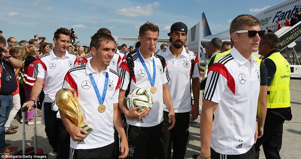 | Schweinsteiger, Mueller, Khedira, Lham vẫy tay chào NHM ngay tại sân bay. |