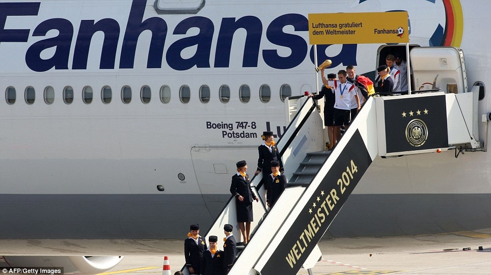 | Đội trưởng Philipp Lahm tay cầm chiếc Cup VĐTG bước ra khỏi chuyến bay bay Boeing 747-8 được phục vụ riêng cho ĐT Đức. |