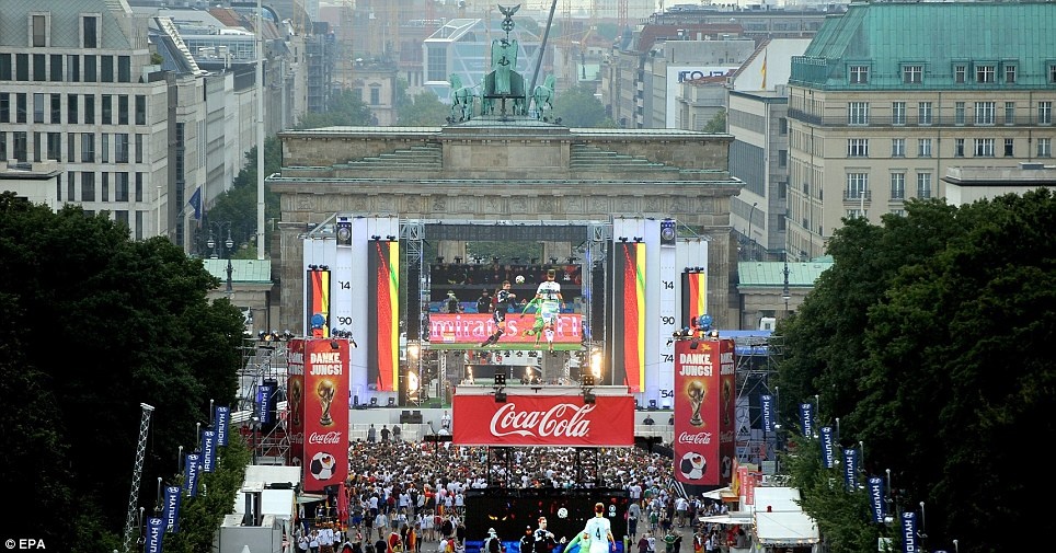 Tại màn hình ở cổng chào Brandenburg có phát lại những khoảnh khắc của trận chung kết khi Đức đánh bại Argentina 1-0, cùng với những chiến tích khó quên trong lịch sử của Mannschaft.