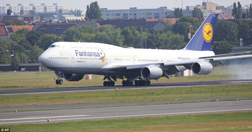 | Chiếc máy bay chở tuyển Đức hạ cánh xuống Berlin thu hút sự chú ý ngay từ khi còn... trên trời. |