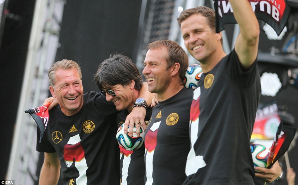 | HLV Joachim Loew cùng trợ lý Andreas Koepke, Hansi Flick và quản lý đội Oliver Bierhoff vẫy tay chào NHM. |