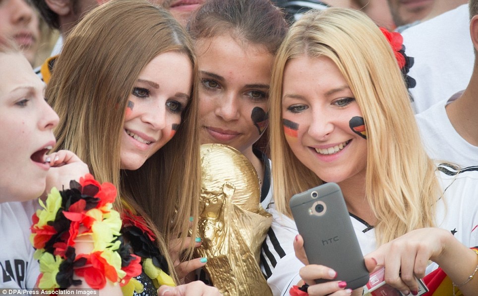 | Một người hâm mộ chụp hình đội từ trên cửa sổ. Đối với các CĐV Đức họ phải chờ đến 24 năm mới lại được tận hưởng cảm giác sung sướng chào đón đội lên ngôi VĐTG. |