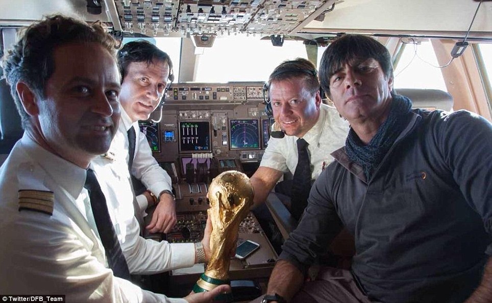 | HLV Joachim Loew cùng chiếc Cup VĐTG chia vui cùng tổ lái trên chuyến bay trước khi trở về Đức. |