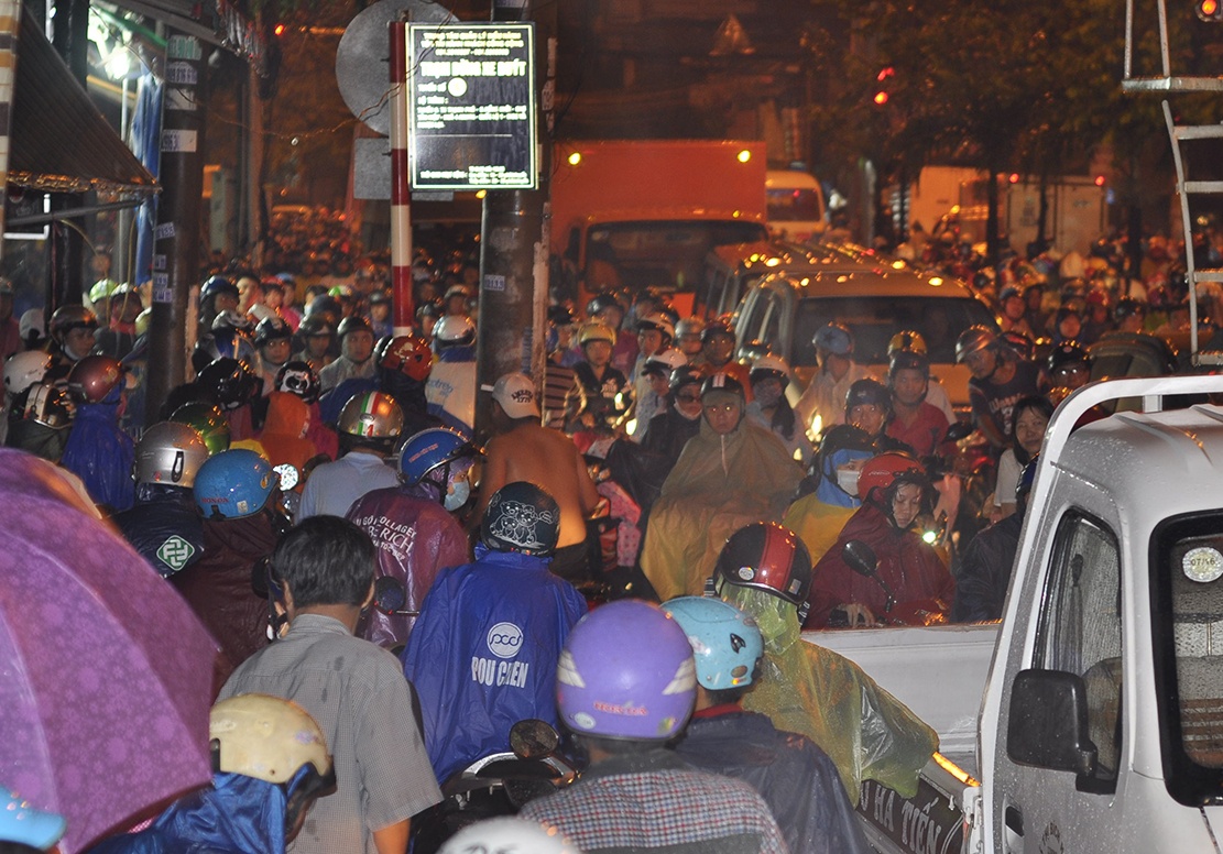 | Người dân chen kín cả lề đường với hy vọng có thể di chuyển và tránh ngập nhưng họ lại càng khiến ùn tắc thêm nghiêm trọng. |