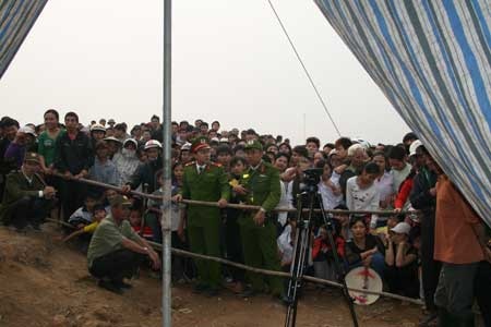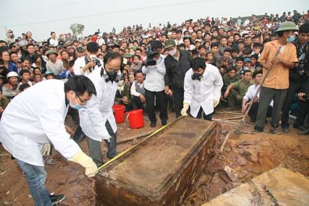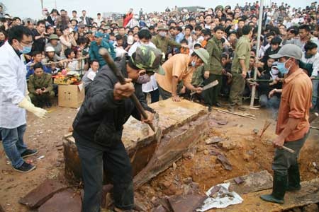 Lượng người càng đông hơn khi chiều 10/12, PGS.TS Nguyễn Lân Cường, Tổng Thư ký Hội khảo cổ học Việt Nam cùng các chuyên gia khảo Viện Khảo cổ học và Bảo tàng Hà Nội tiến hành mở nắp chiếc quan tài cổ.