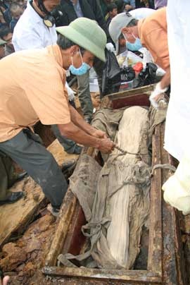 Trao đổi với PV, PGS.TS Nguyễn Lân Cường cho biết: “Nhiều khả năng đây là ngôi mộ thuộc thời Hậu Lê, có niên đại trên dưới 300 năm. Người quá cố là một phụ nữ, khoảng 60 tuổi. Trong quan tài không thấy dung dịch, có thể đã bị chảy ra ngoài qua kẽ hở. Trước đây, một số ngôi mộ cổ đã được phát hiện, đều có dung dịch (chưa rõ là chất gì) để bảo quản, giữ nguyên xác trong hàng trăm năm… Trong miệng của cụ bà này, chúng tôi tìm được một đồng tiền cổ”.