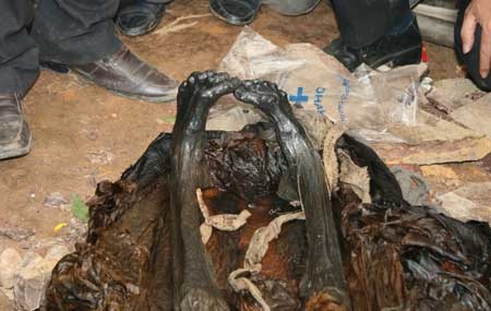 | Thi hài người quá cố được bó chặt bằng nhiều lớp vải và chèn bằng những cuộn giấy bản. |