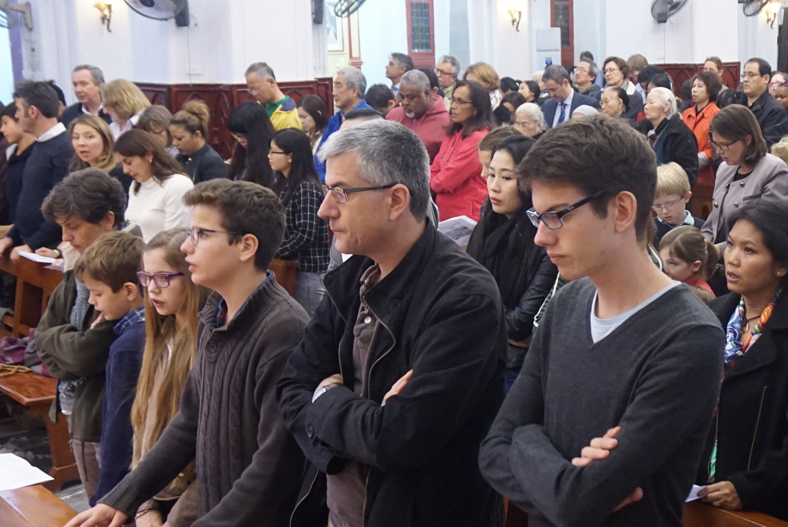 | Nhiều người nước ngoài chờ đến giờ làm lễ bên trong nhà thờ Lớn Hà Nội. Ảnh: Duy Hiếu. |