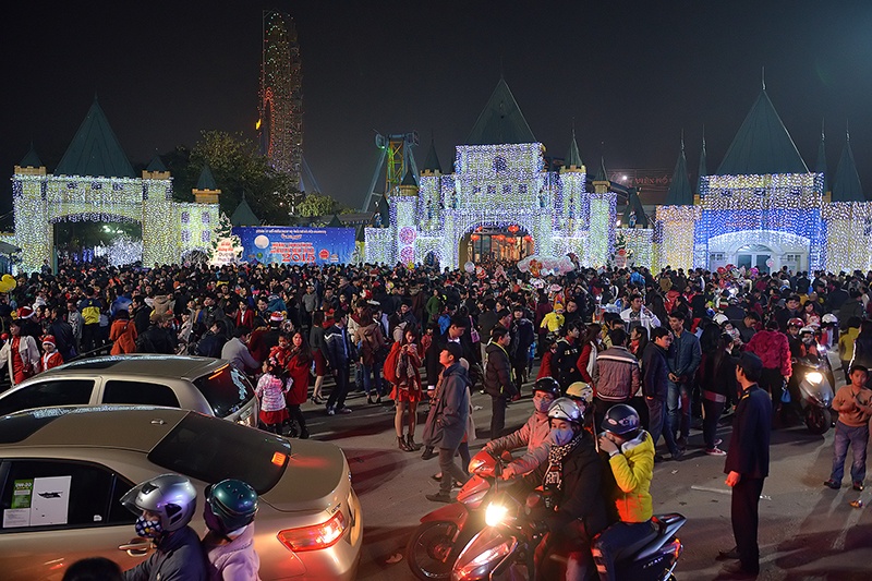 | Hàng nghìn người đổ về công viên nước hồ Tây để chiêm ngưỡng con đường tuyết rơi nhân tạo độc đáo. Ảnh: Lê Hiếu. |