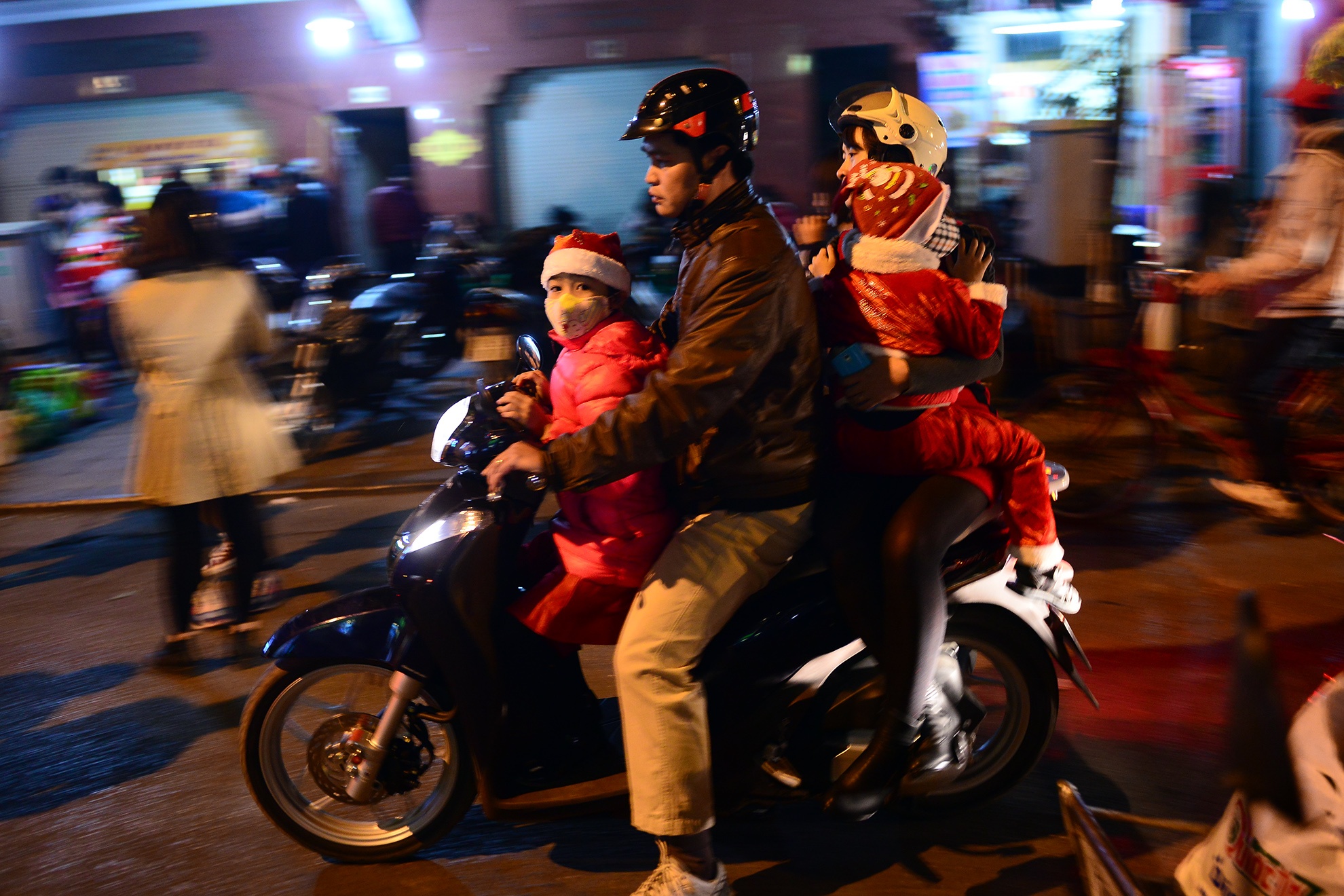 | Các gia đình chở trẻ nhỏ đi chơi trên đường Đinh Tiên Hoàng, quận Hoàn Kiếm trong tiết trời 16 độ C. Ảnh: Tuấn Mark. |