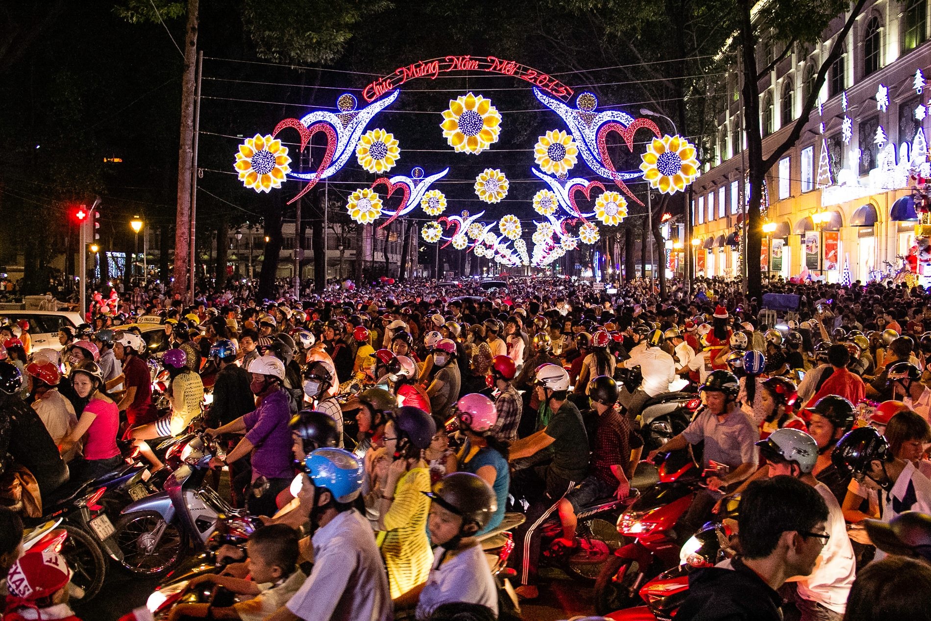 | Các tuyến đường phố trung tâm TP.HCM rực rỡ ánh đèn hoa. Người dân đổ ra đường tiến về phía trung tâm quận 1, quận 3 khiến cho giao thông bị kẹt cứng ngay từ 19h tối 24/12. Ảnh: Hải An. |