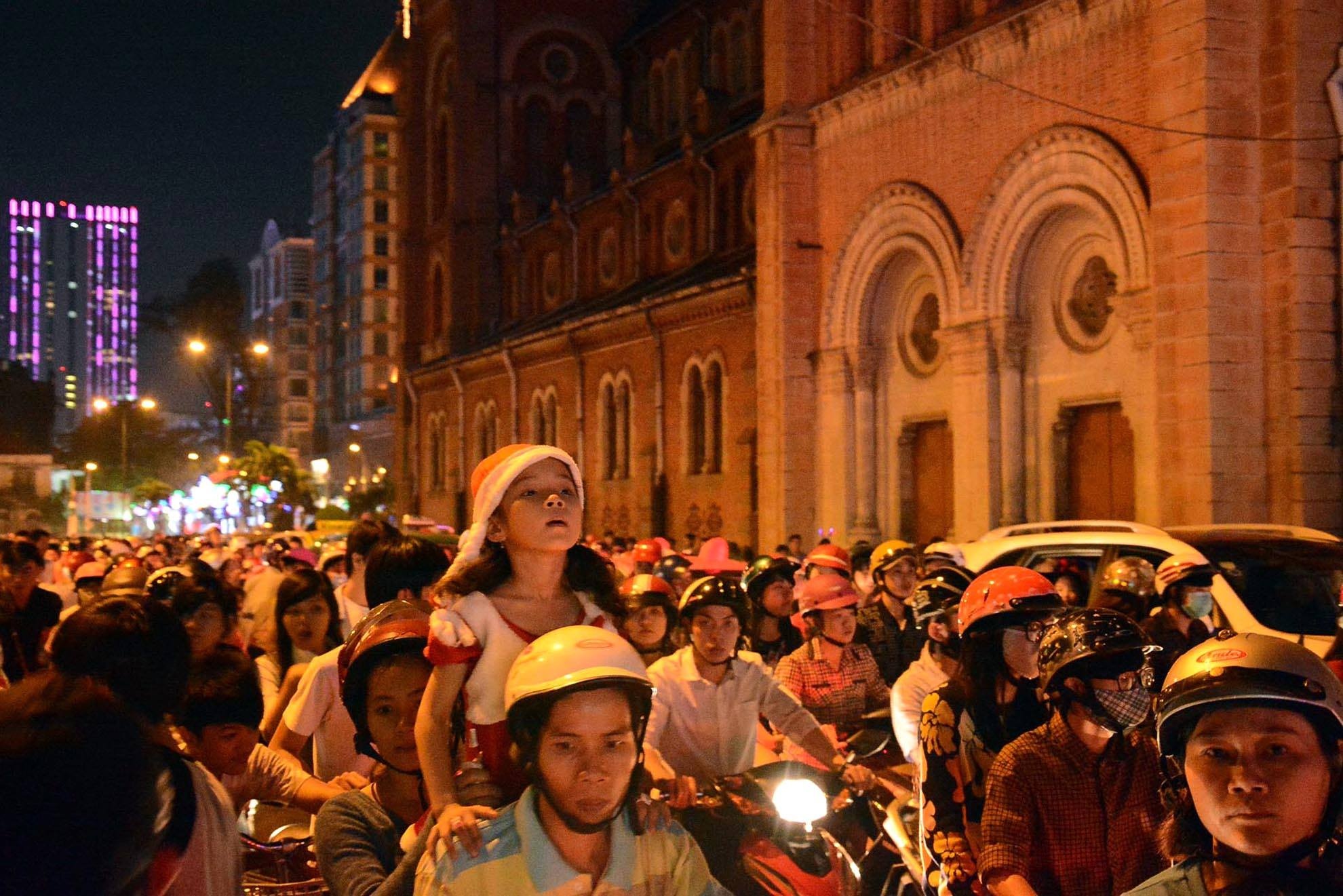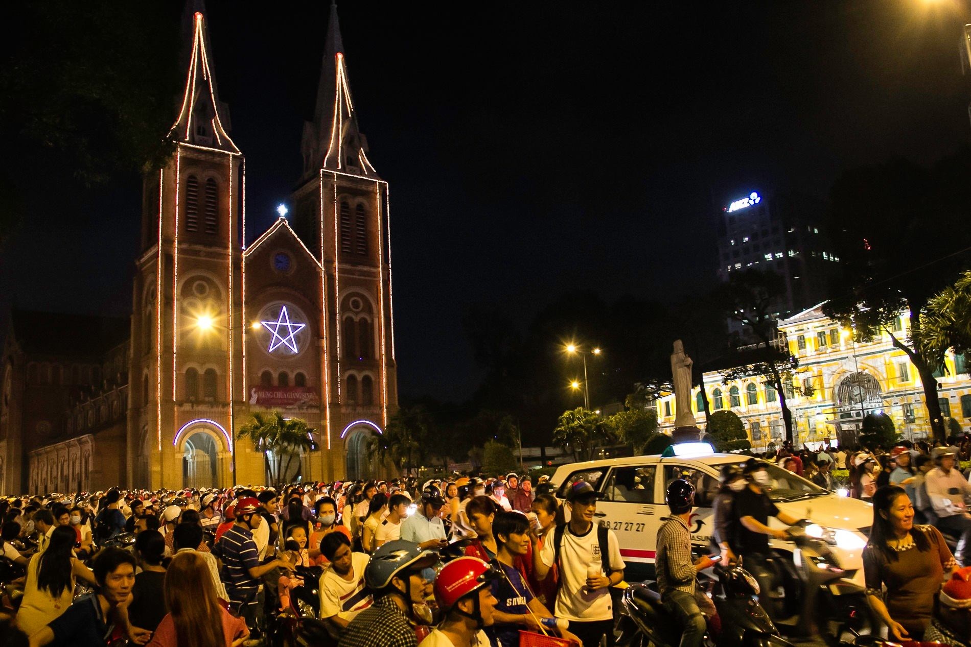 | Xung quanh nhà thờ Đức Bà Sài Gòn không còn một chỗ trống lúc 21h. Ảnh: Hải An. |