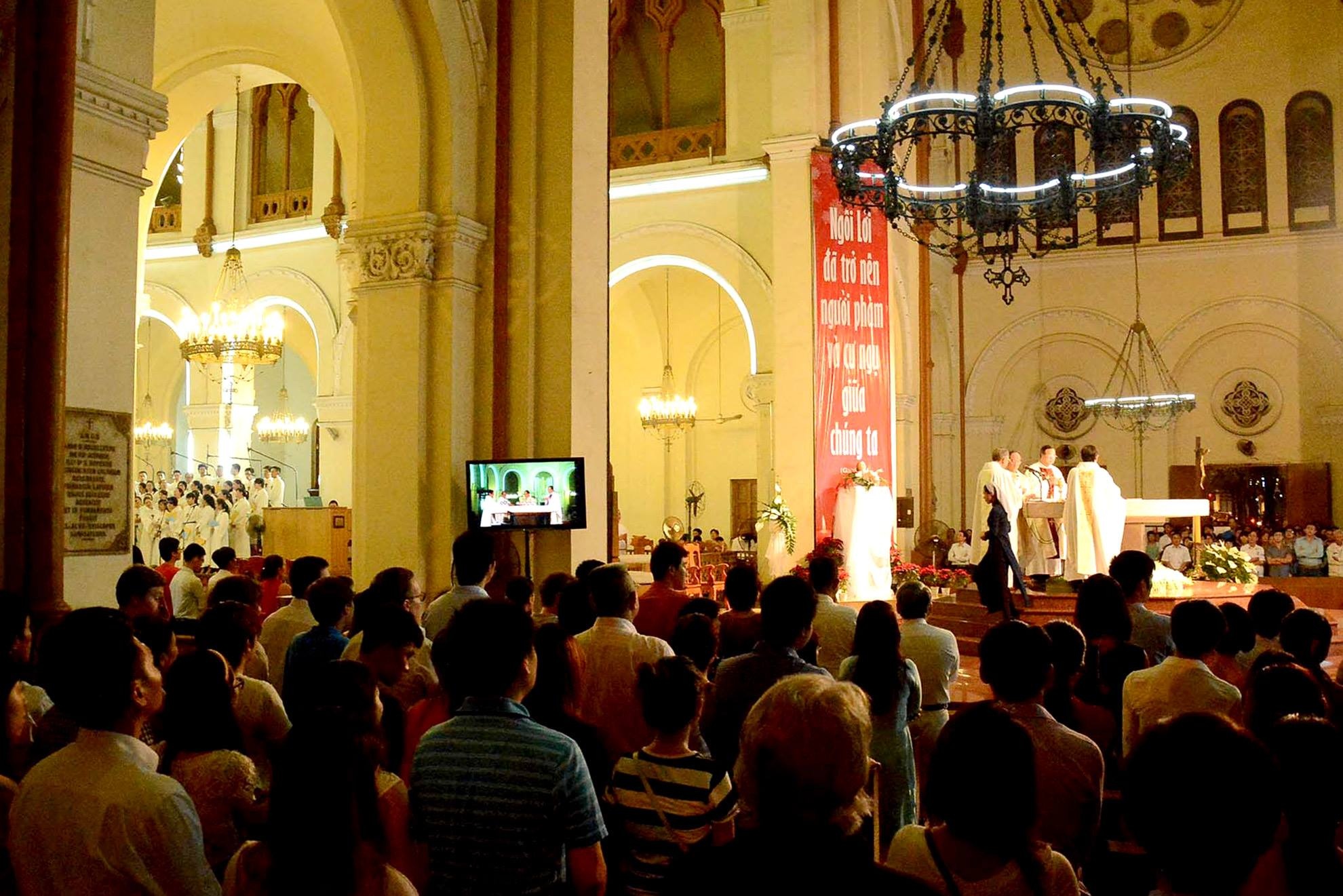 | Lễ đón chúa Giêsu ra đời lúc 0h ngày 25/12 tại nhà thờ Đức Bà Sài Gòn. Ảnh: Minh Thanh. |